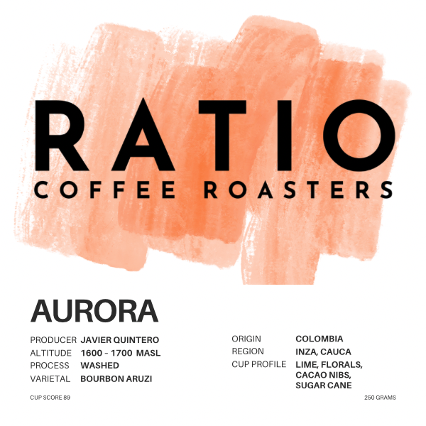 Experience a stunning washed Bourbon Aruzi from producer Javier Quintero, grown at 1600–1700 masl in Inza, a celebrated coffee region within Cauca in the highlands of Colombia. With an impressive cup score of 89, this coffee delivers a vibrant and layered profile: zesty lime, elegant florals, deep cacao-nib richness, and clean sugar-cane sweetness.